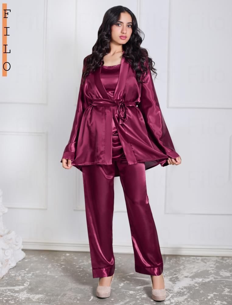 أظهري أنافتكِ مع طقم بيجاما الحرير . مصمم بقميص داخلي وقميص بربطة أمامية، مع بنطال مريح ، إنه الطقم المثالي للأناقة والراحه.