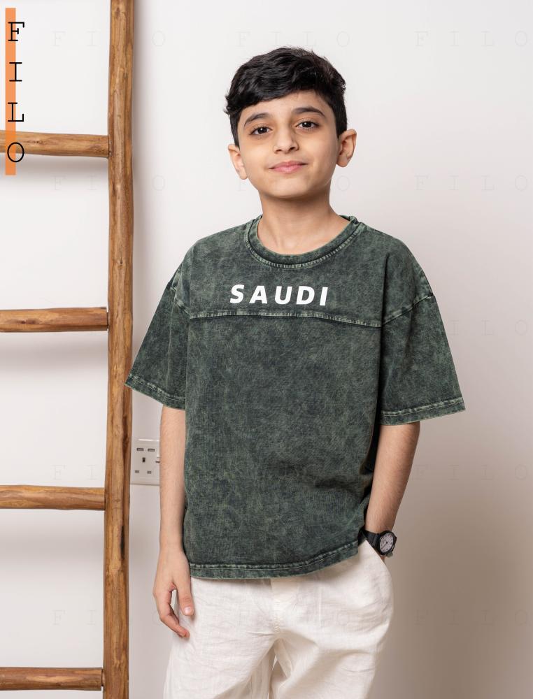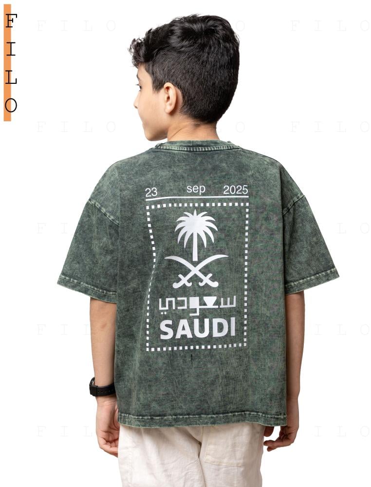 تيشيرت سعودي باللون الأخضر المغسول بتأثير Vintage يعكس روح الأصالة مع لمسة حديثة، مزود بتصميم خلفي يحمل شعار السيفين والنخلة داخل إطار يشبه الطابع البريدي، مع كتابة 23 SEP 2025 احتفاءً باليوم الوطني السعودي.