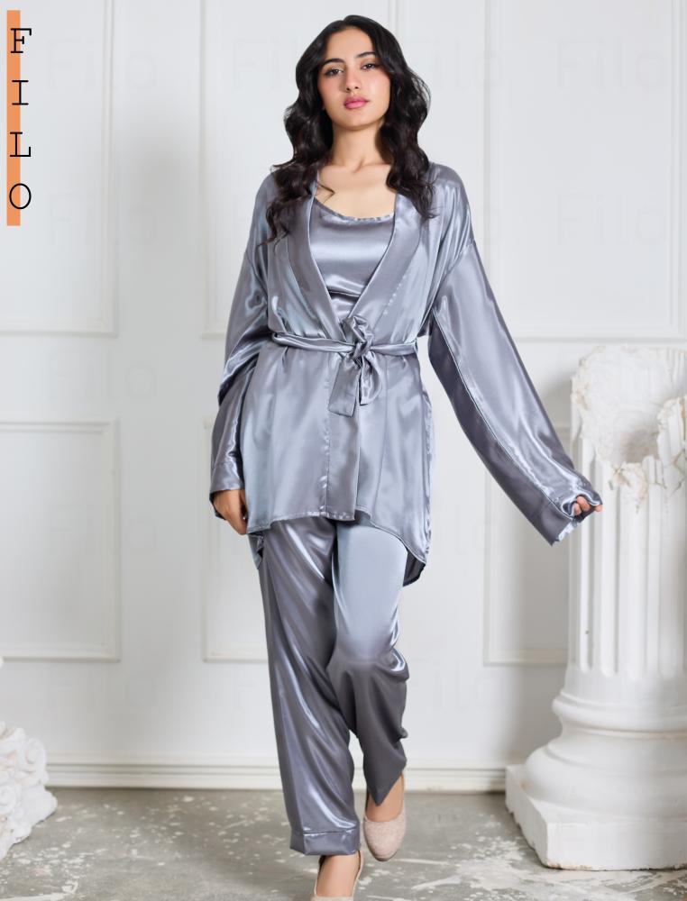 أظهري أنافتكِ مع طقم بيجاما الحرير . مصمم بقميص داخلي وقميص بربطة أمامية، مع بنطال مريح ، إنه الطقم المثالي للأناقة والراحه.